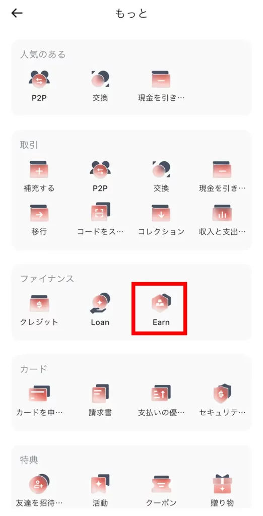 ホーム画面から「もっと」をタップし、ファイナンスカテゴリの「Earn」を選択します。