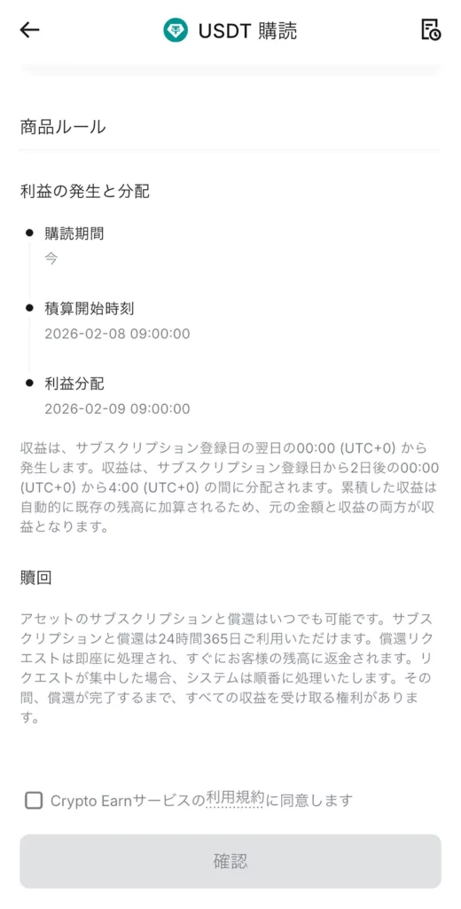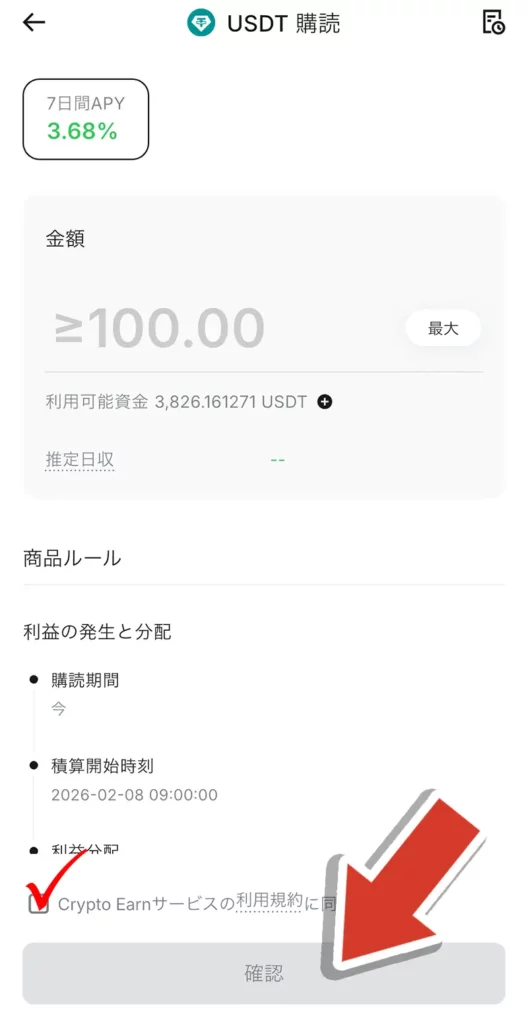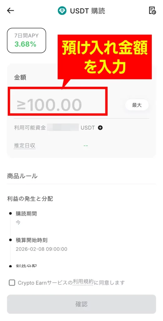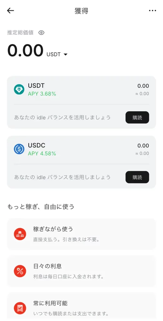 USDTの商品には、この時点での APY(年利)3.68%、および 償還(払い戻し)はいつでも可能 と表示されています。