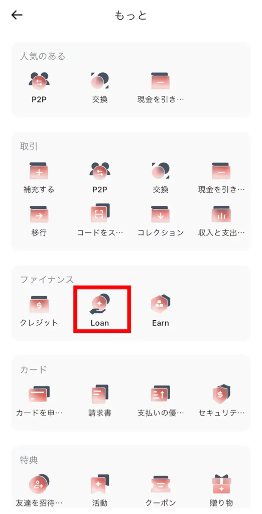 - ローン:USDT や USDC などのステーブルコインを借りる仕組みで、暗号資産の運用や取引などでの利用を想定した機能です。