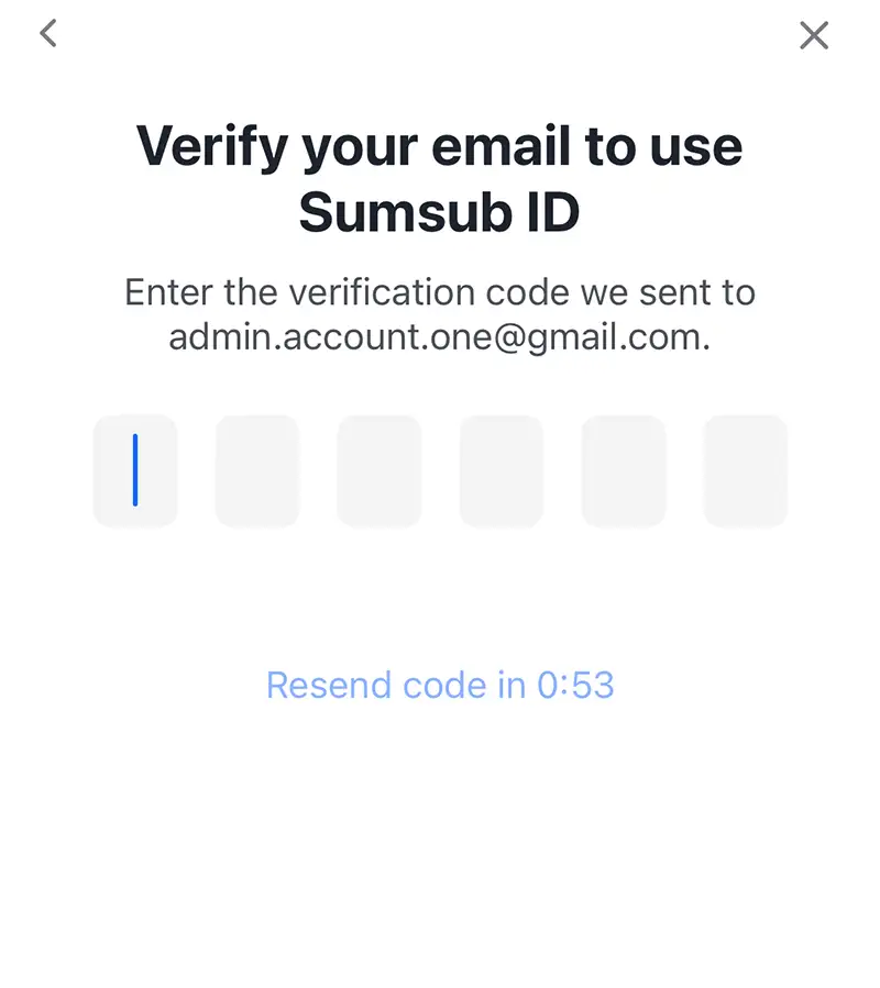 「Verify your email to use Sumsub ID」の画面で、メールに届いた認証コードを入力します。