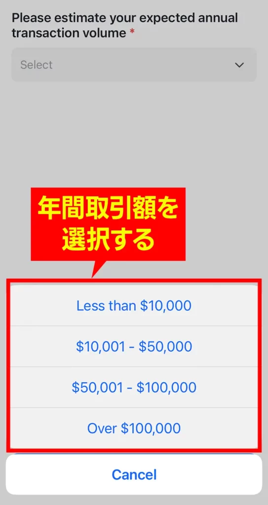 「Please estimate your expected annual transaction volume」で、おおよその年間取引額を選択します。