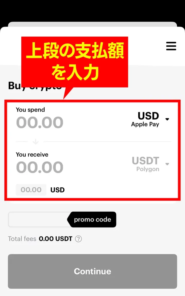 上段が支払額、下段が購入できるUSDTの数量です。
