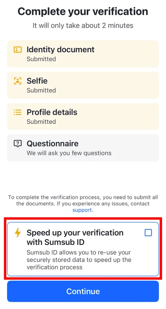 画面下の「Speed up your verification with Sumsub ID」を選択すると、本人確認を比較的簡単に行うことができます。
