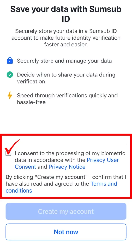 「Save your data with Sumsub ID」の画面下にあるチェックボックスにチェックを入れておくと、提出した本人確認書類が保存されます。