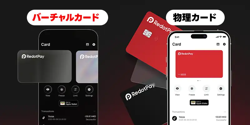 カードは、すぐ使える「バーチャルカード」と、実店舗・ATM対応の「物理カード」の2種類に対応しています。