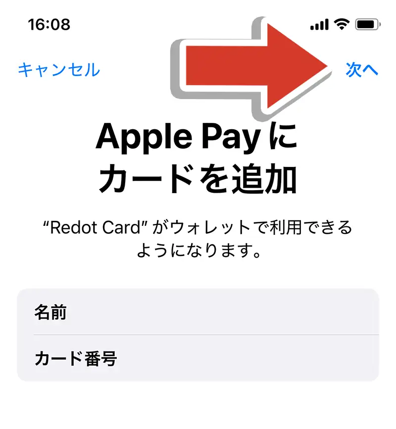 「Apple Pay にカードを追加」の画面で、名前とカード番号を確認し、「次へ」をタップします。
