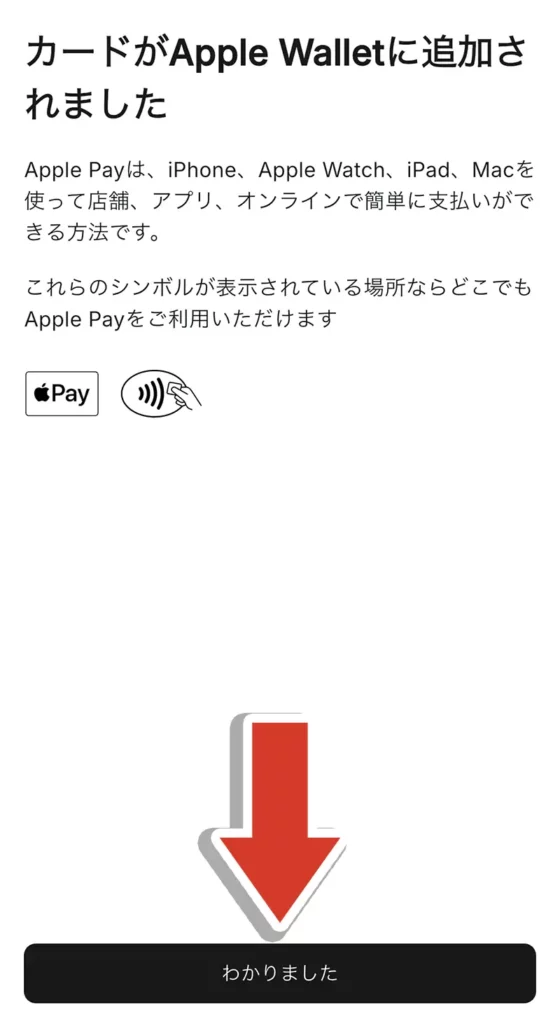 「カードがApple Walletに追加されました」と表示されたら、「わかりました」をタップして追加は完了です。