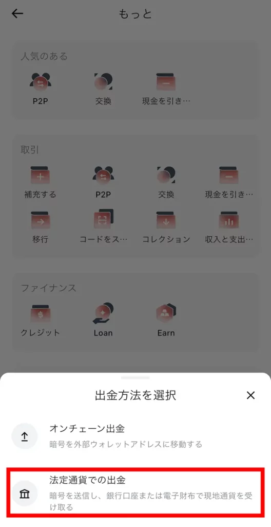 出金方法の選択で「法定通貨での出金」を選択します。