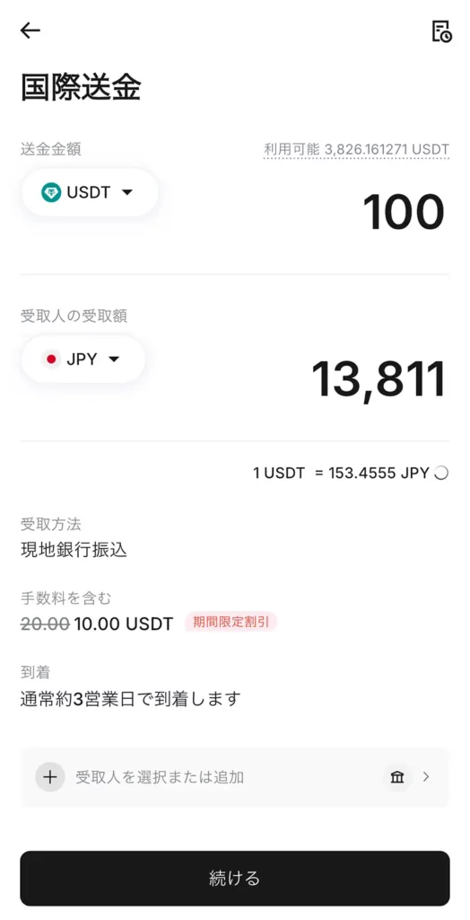 受領額を日本円(JPY)に設定した場合、Swift送金が利用できず、現地銀行振込になる場合があります。