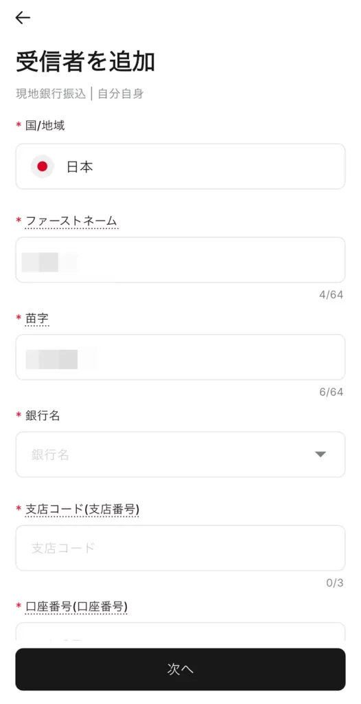- 受取人名:自分自身の氏名をローマ字で入力