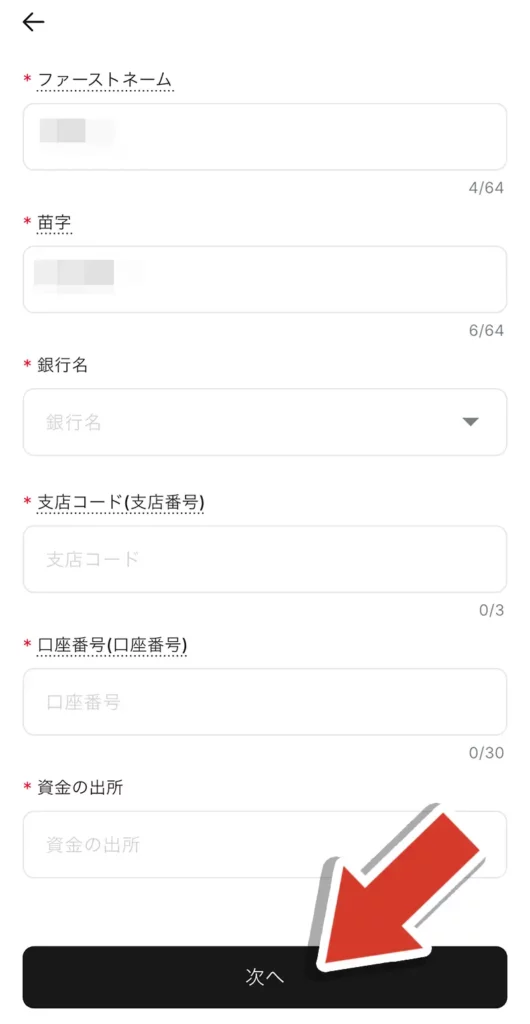 この場合は、支店番号や資金の出所などの追加情報の入力が必要になります。