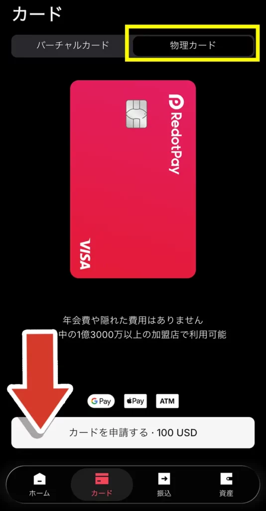 物理カードを選択し、「カードを申請する・100USD」をタップします。