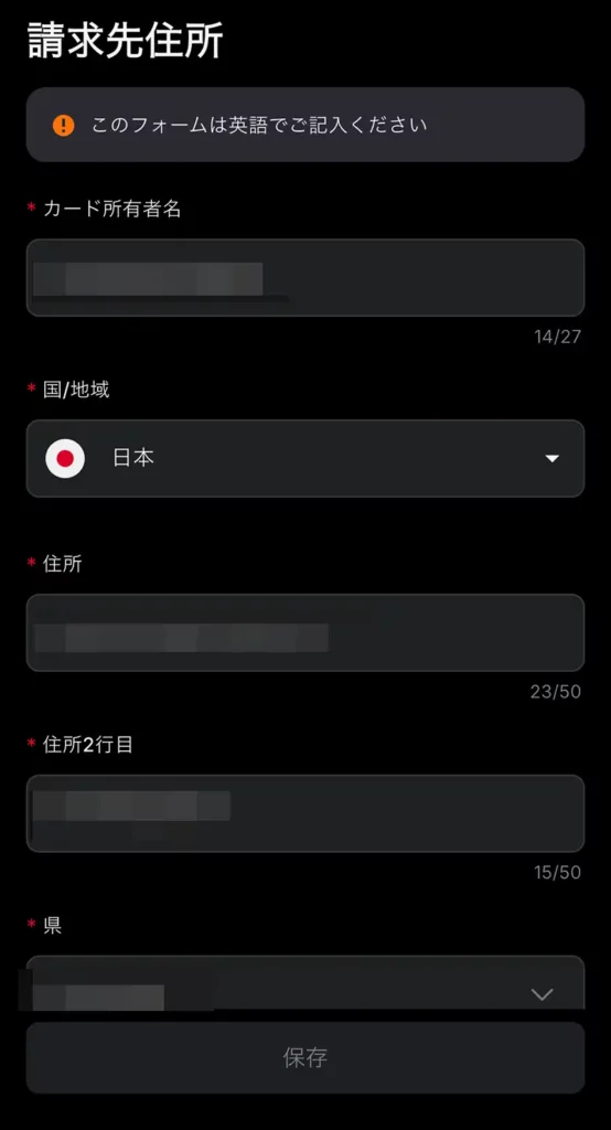 - 住所(2行目):住所情報を入力(建物名・部屋番号など)