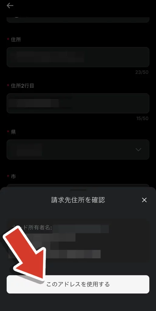 「請求住所を確認」で入力内容を確認し、「このアドレスを使用する」をタップすると、住所の登録が完了します。