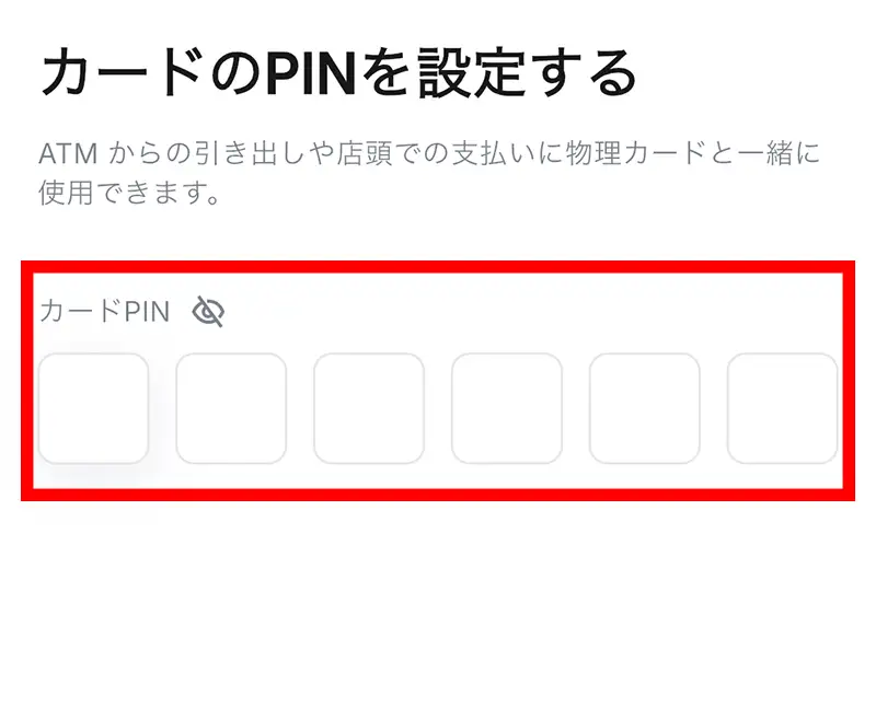 次に、カードのPIN(暗証番号)を設定します。「カードのPINを設定する」をタップし、ATMでの引き出しや店舗での利用時に必要となる PIN を設定してください。