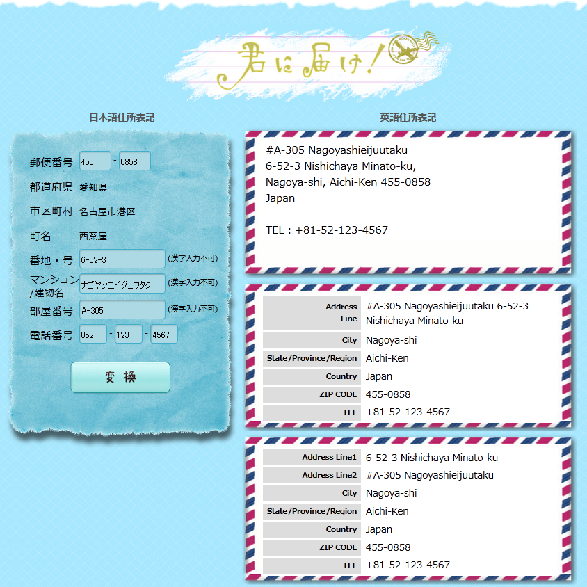 住所を英語表記に簡単変換 - 君に届け!住所を3パターンの英語表記に同時変換します。分かりにくい海外サイトの会員登録や宛名などにぜひご活用ください。以下の項目を入力してください。