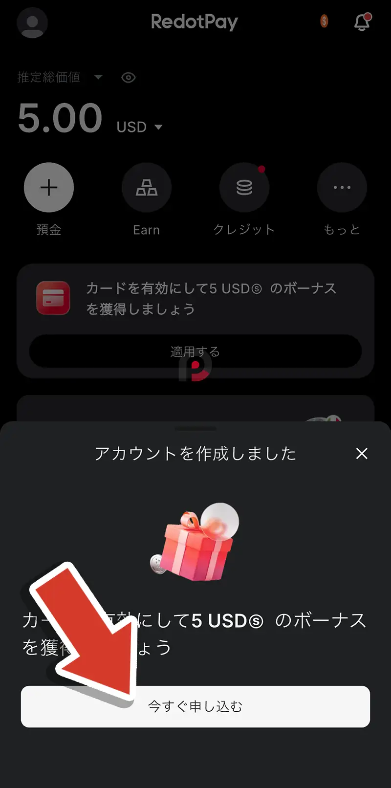 登録が完了してログインすると、無料の5ドルボーナスが付与されます。