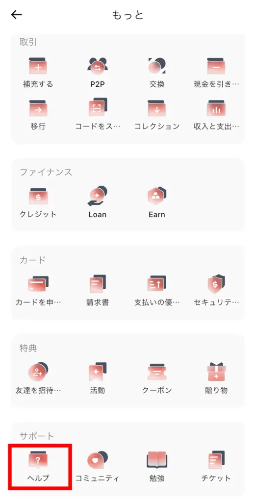 ホーム画面から「もっと」→「ヘルプ」を選択すると、主な FAQ(よくある質問)を確認できるほか、チャットサポートも利用できます。