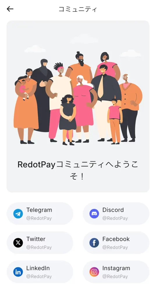 ホーム画面から「もっと」→「コミュニティ」を選択すると、Redotpay の Telegram や Discord などのユーザーコミュニティにアクセスできます。