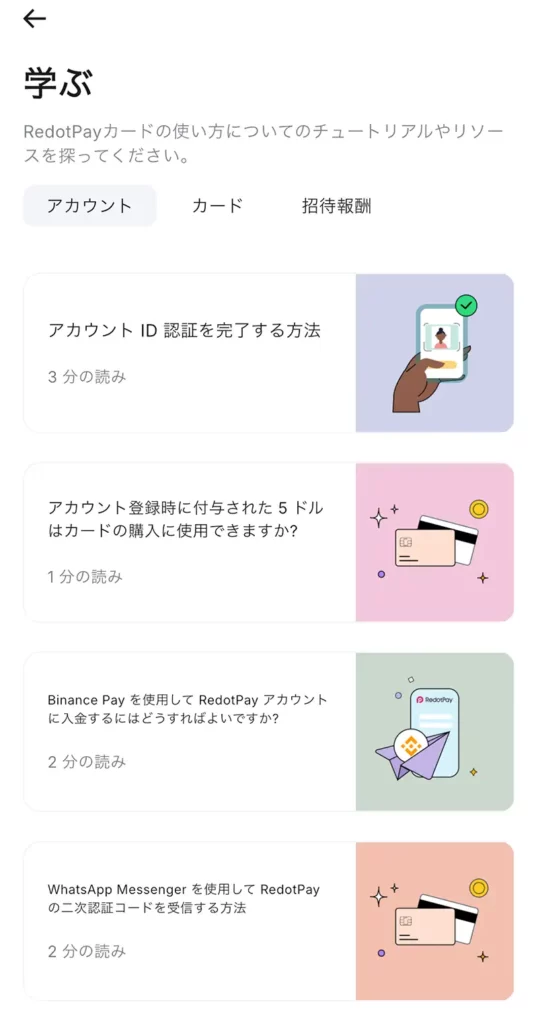 ホーム画面から「もっと」→「勉強」を選択すると、Redotpay の基本的な使い方や機能の解説コンテンツが掲載されています。