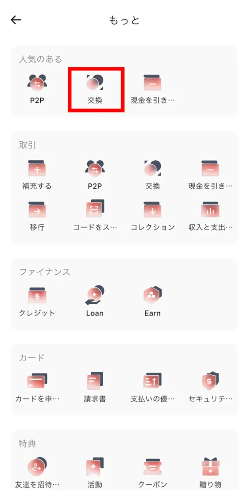 ホーム画面から「もっと」をタップし、「交換」を選択します。