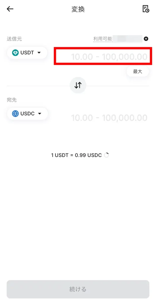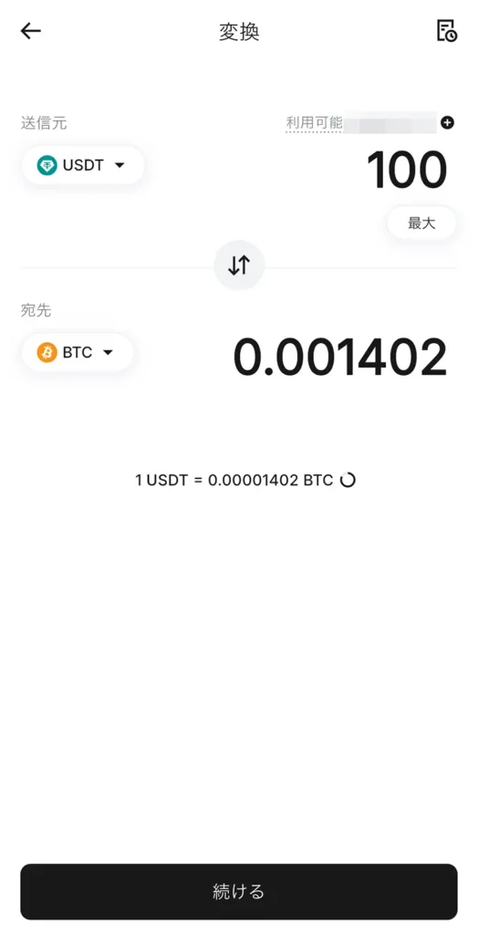 「宛先」で、交換したい通貨を選択すると、交換後に受け取れる数量が表示されます。